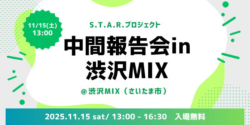 S.T.A.R.プロジェクトの中間報告会を11月15日13時から、渋沢MIX(さいたま新都心)で開催されます。クリエイタの取組に興味関心のある方は、どなたでもご参加いただけます。皆さまのご来場をお待ちしております。